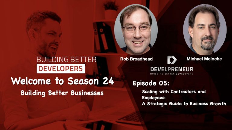In the “Building Better Businesses” season of the Building Better Developers podcast, Rob Broadhead and Michael Meloche provide strategic insights into scaling with contractors and employees. They discuss key factors involved in hiring, training,…